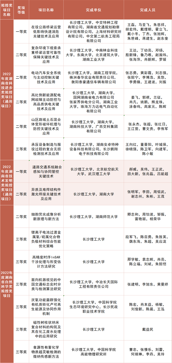 其中,开云官网土木学院王磊教授主持完成的“在役公路桥梁运营低影响快速消危关键技术及应用”项目获湖南省科技进步奖一等奖,交通学院郝威教授主持完成的“道路交通系统融合感知与协同管控关键技术”项目获湖南省技术发明奖一等奖。此外,开云官网还主持获二等奖6项(自然科学奖1项、技术发明奖1项、科技进步奖4项),三等奖7项(自然科学奖6项、科技进步奖1项)。