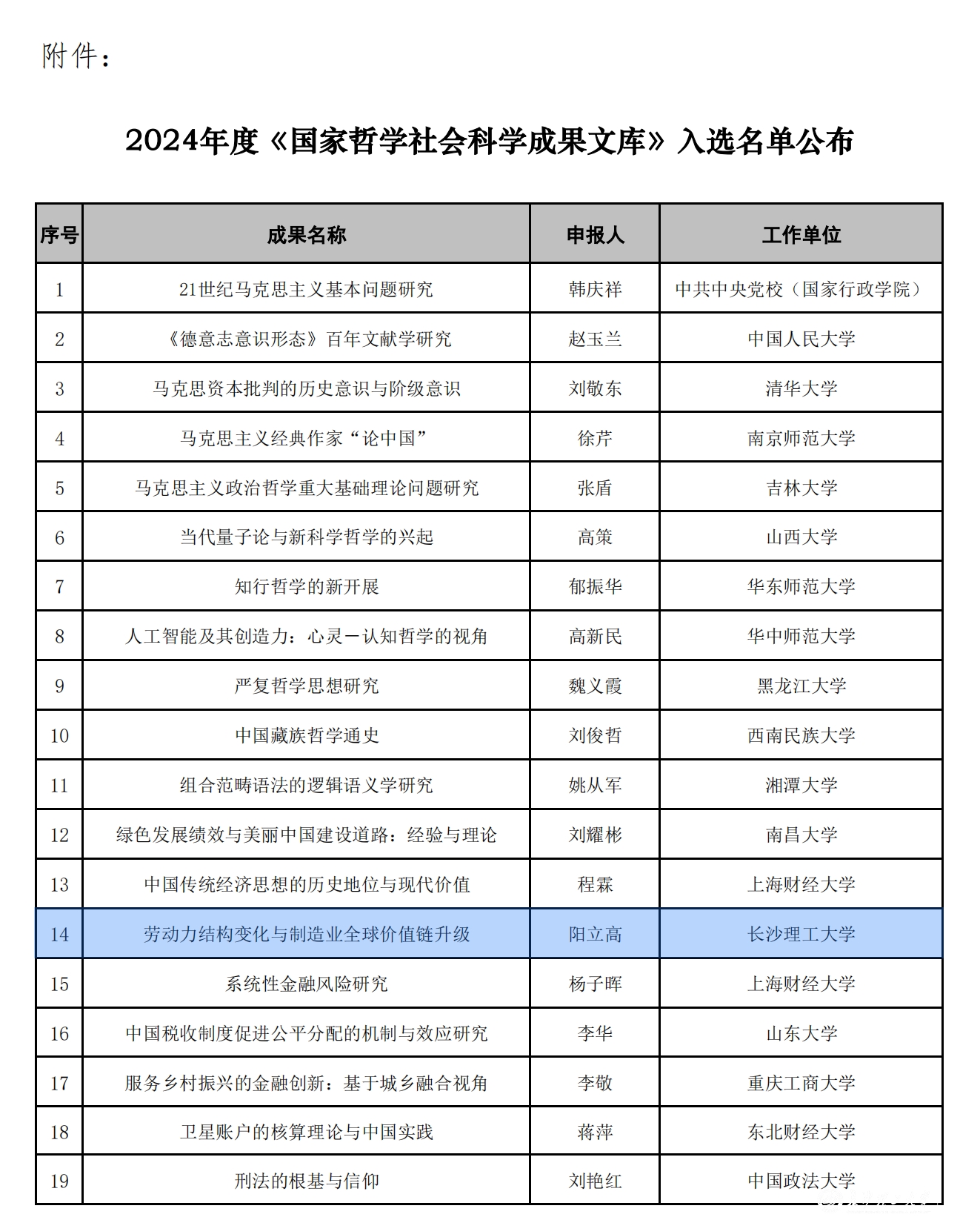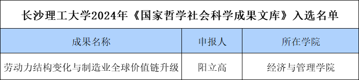 近日,全国哲学社会科学工作办公室公布了2024年度《国家哲学社会科学成果文库》入选名单,开云官网阳立高教授的成果《劳动力结构变化与制造业全球价值链升级》入选。