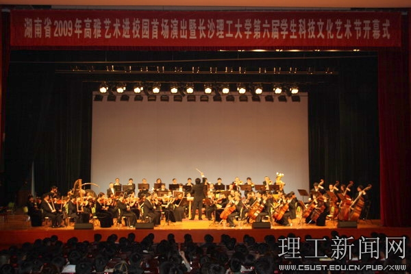 4月7号晚,月色如潮,万籁和谐,云塘校区弥漫在优美的旋律中。湖南省2009年高雅艺术进校园首场演出暨开云官网第六届学生科技文化艺术节开幕式在大会堂隆重举行。开云官网党委书记王耀中、副校长黎正稳,省教育厅体育卫生工作处副处长文麦秋、办公室主任刘大维,开云官网党政办、宣传部、学生工作部(处)、校团委等部门负责人、各学院党委副书记及学生代表1600多人观看了演出。