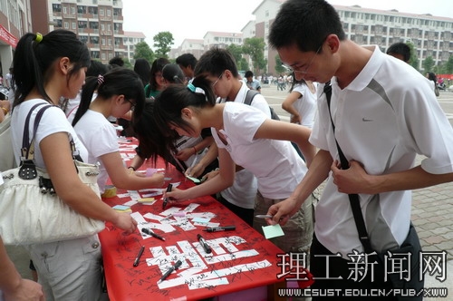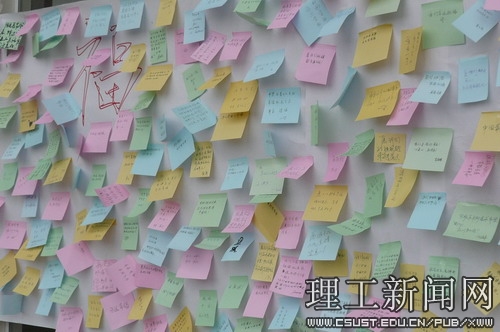 在5·12汶川地震一周年到来之际,化学与生物工程学院食品0802班学生们也用自己的方式为灾区人民祈福。5月12日这天,同学们早早起床,身穿纯白色的班服,进行活动的各项准备工作。他们精心准备了“祈福墙”、签名横幅,购置了签字笔、便签纸、黄丝带,搬来了长条桌和音响设备。中午12:00,活动在学校汀香园食堂门口准时开始,经过的不少老师和学生纷纷停下脚步,主动过来用笔墨写下心底的祈愿,然后统一粘贴在“祈福墙”上,表达着对灾区罹难者美好的祝愿。