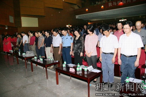 5月12日下午,学工部在学校大会堂组织进行“青春之歌颂祖国”合唱比赛。比赛之前,全场人员包括学校领导、有关部门负责人、各学院党委副书记、全体学生辅导员以及学生共1600余人,全体起立,为地震中逝去的同胞默哀1分钟,表达了全体师生的沉痛悼念之情。