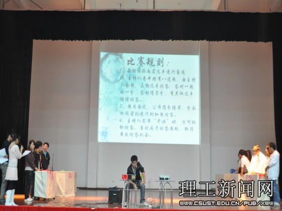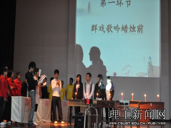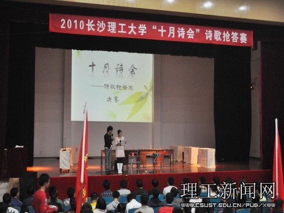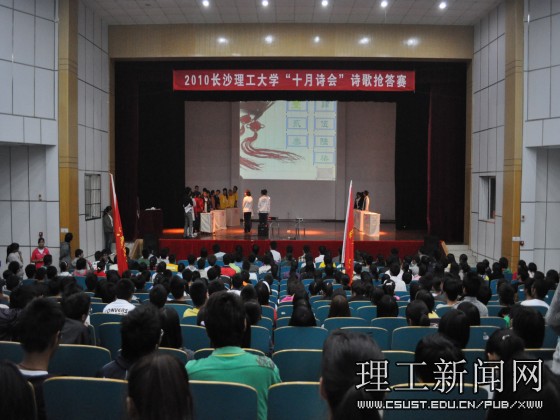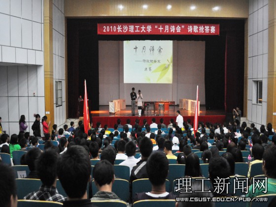 10月20日晚7点,学生活动中心一楼报告厅座无虚席、人头攒动。开云官网2010年十月诗会诗歌抢答赛决赛在此举行。经济与管理学院代表队、文法学院代表队、水利学院代表队、计算机与通信工程学院代表队、交通运输工程学院代表队、化学与生物工程学院代表队参与激烈的角逐。