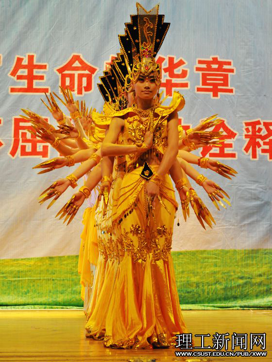 由聋哑人表演的舞蹈《开门红》、《黄土黄》,盲人表演的葫芦丝独奏《月光下的凤尾竹》、吹火柴盒《苗岭的早晨》,肢残者表演的舞蹈《鹰之翼》、歌曲《荷塘月色》、《春天里》、小品《别无选择》、摇滚串烧等,一次次将现场的气氛推向高潮。双手截肢的王剑华现场用口含毛笔书写了“博学、力行、守正、拓新”八个大字,并赠予学生代表。舞蹈《千手观音》压轴登场,无声世界里的她们用整齐划一的动作,美伦美焕的造型,令现场沸腾。同学们纷纷跑下看台,近距离观看。