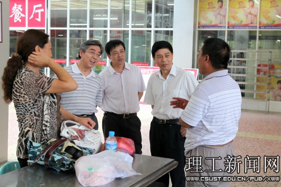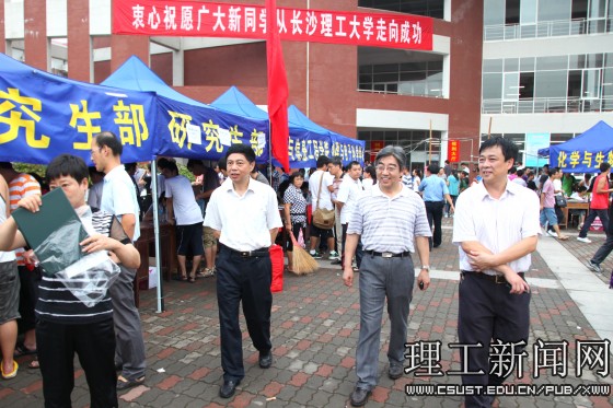 学校领导高度重视迎新工作,亲临迎新现场,询问迎新情况,慰问参加迎新工作的老师和志愿者。2日下午,校党委书记王耀中、校长郑健龙等在校领导陆续亲临迎新现场检查指导工作。在迎新站点,王耀中书记、郑健龙校长仔细询问了解新生报到情况,详细检查迎新准备工作情况,亲切看望新生和家长,慰问接待点的师生、医疗保障人员和迎新志愿者。9月3日上午,李明副校长在学工部部长邹兴平的陪同下来到火车站接站点,慰问接站点工作人员,并嘱咐他们一定要热情为新生和家长做好服务工作。