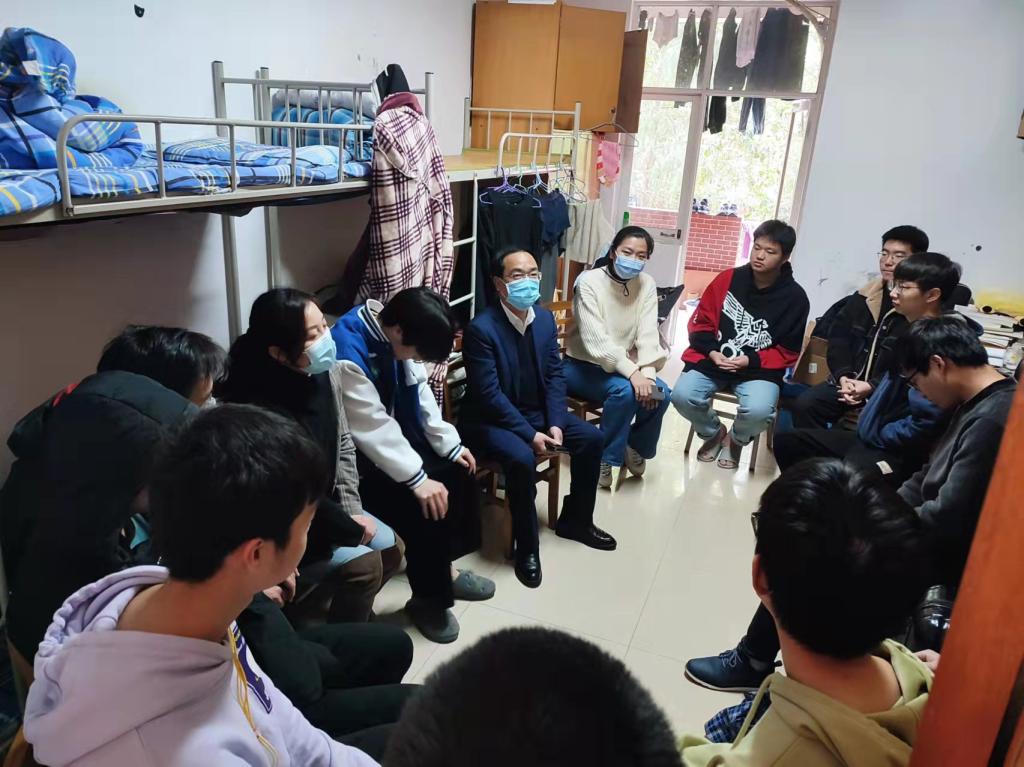 党委书记丁丹、副书记唐青、副院长阳立高、辅导员戴逢哲一行来到弘毅轩三栋男生宿舍,和学生亲切交流,讲解疫情防控政策,了解学生学习生活困惑。唐青、何涛召开学生干部会议,收集疫情防控学生管理中的问题。