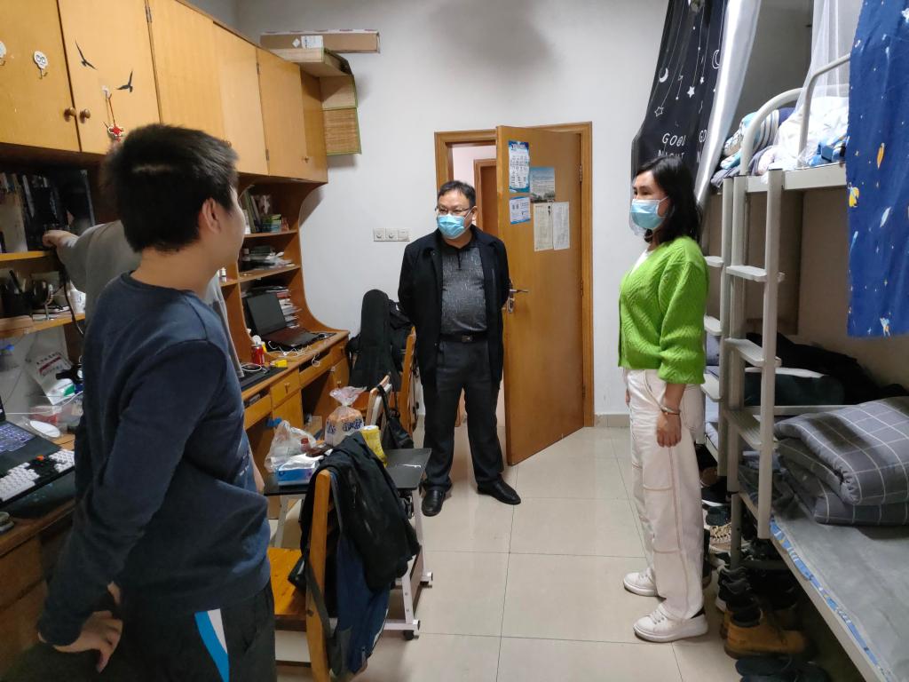 随后,学院领导深入走访学生宿舍,唐超文与学生亲切交谈,询问毕业生的毕业论文进展情况、考研复试和就业情况,提醒同学们要按时进行易班打卡,出入公共场所要带口罩、加强防护、注意宿舍用电安全。此外,唐超文也对学生关于复试体检、外出参加考试等问题给予解答,唐超文表示,同学们的切实需求,学院会详细研判,结合疫情防控的形势,尽量满足同学们的合理要求,让同学们安心备考,不用担心。同时,陈华表示,希望同学们积极配合学校疫情防控工作,遇到问题或突发情况及时与辅导员沟通,展现毕业生的良好风貌,为低年级同学做好榜样。