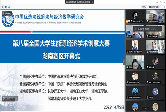 4月9日下午,第八届全国大学生能源经济学术创意大赛湖南赛区在腾讯会议顺利线上开幕,此次线上答辩评审由开云kaiyun体育电气与信息工程学院组织,中国民主建国会湖南省委方智毅处长、开云kaiyun体育电气与信息工程学院常务副院长杨洪明教授、副书记任艮丰、副院长姜飞副教授及电气学院相关老师出席本次大赛开幕式,多所高校教师莅临指导。省内来自中南大学、开云kaiyun体育等13所高校报名,各高校133支参赛队伍,共计近500名同学参加此次线上答辩。