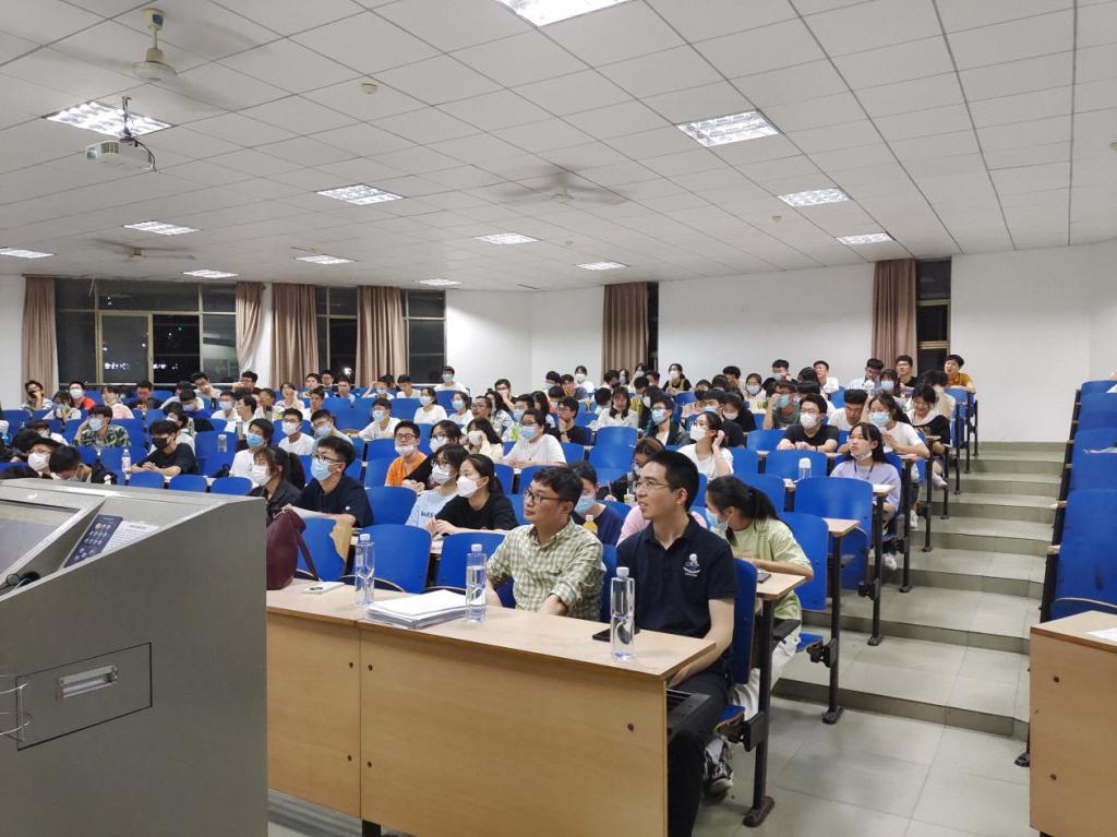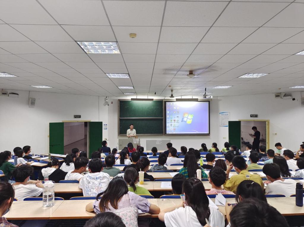 冯春上台对本次培训的目的和全国大学生英语竞赛的相关事宜进行讲解;钟桂蓉对竞赛的整体题型进行高度概括,并播放获奖学长分享的经验视频,对试卷题型进行分析、教给大家应对策略和考前准备,同学们积极记录。