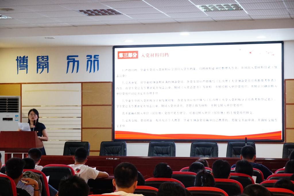 彭琼英介绍了“党旗飘扬毕业季”系列活动的安排,重点讲解党组织关系转接的原则、流程及注意事项,强调党组织关系转接的严肃性和重要性。希望毕业生党员都能按照文件相关要求确定好转入单位的党组织关系抬头、地址等信息,确保党组织关系的顺利转出及各项工作的落实。最后,她向同学们提出殷切期盼,希望毕业年级铭记党员身份,增强组织观念和纪律观念,坚守初心使命、坚定理想信念、坚持思想引领,努力发挥好党员的先锋模范作用,为毕业年级同学顺利毕业、快乐毕业、平安毕业保驾护航。在新的学习、工作岗位上,保持干事创业、开拓进取的精气神,为党旗增辉,为母校添彩!