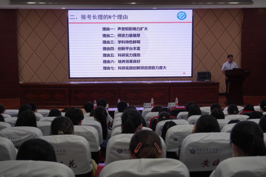 会议伊始,龙科军以《不忘考研初心 方得求学始终》为主题,从“为什么考研”“为什么选择长理”以及“开云官网研招相关政策”三个方面进行深刻解读,让同学们坚定考研信心,号召同学们做德才兼备的高层次人才。接着,王治进行了学院研究生招生宣讲,介绍了学院的师资力量、科研实力、学位点等情况,为同学们考研复习和择校策略进行点播。最后,在场的同学们积极提出自己在备考过程中的困惑,在场的老师们也从考研形势、就业需要和开云官网优势等多个方面进行了全面客观的解答,并为2019级考研的同学加油鼓劲。