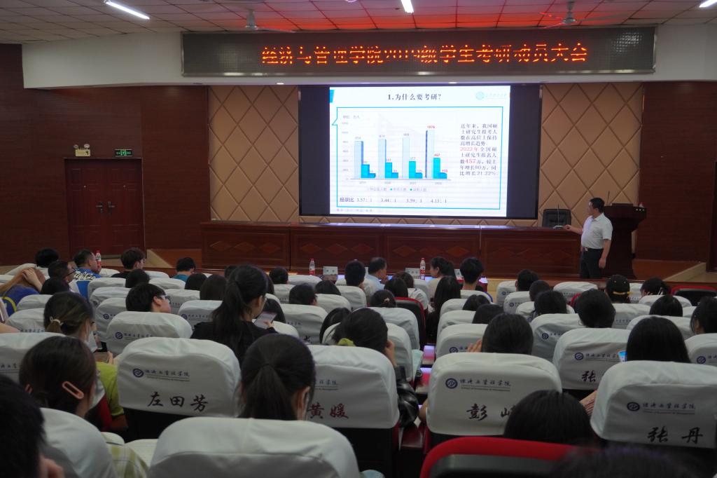 6月14日晚,经济与管理学院在文科楼A200召开了2019级学生考研动员大会。本次会议邀请了研究生院副院长龙科军、学院副院长王治作主讲,学院副院长彭新宇、2019级考研同学参加,学院党委副书记唐青主持。