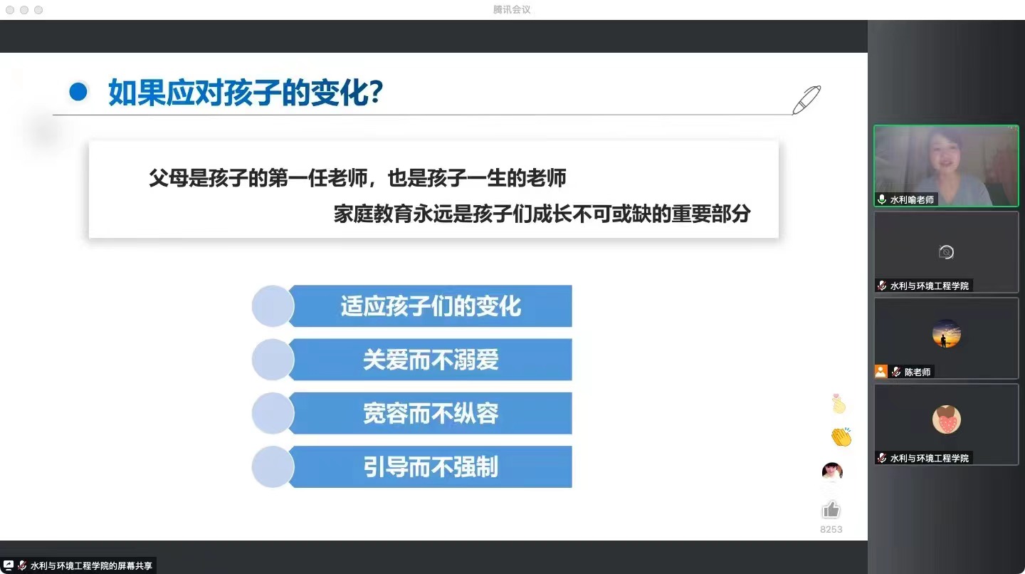 为深入推进家校协同育人,凝聚育人合力,8月25日晚,水利与环境工程学院召开2022级本科新生线上家长会,院党委书记喻玲娜、院长陈杰、党委副书记银波、2022级辅导员刘灿、陈鑫林出席会议,来自全国各地的600余名新生家长参加,会议由银波主持。