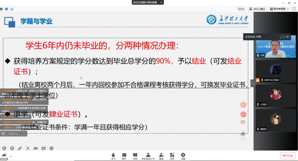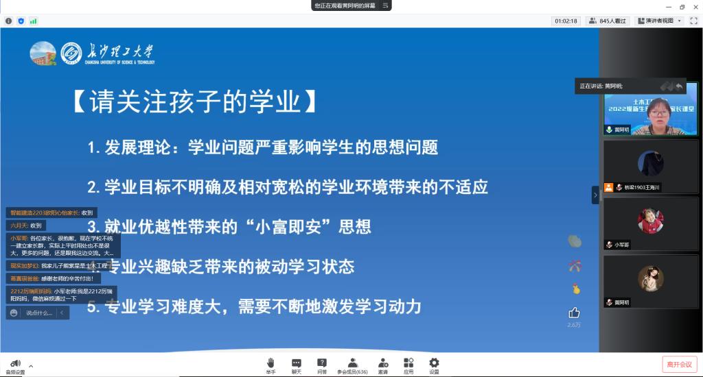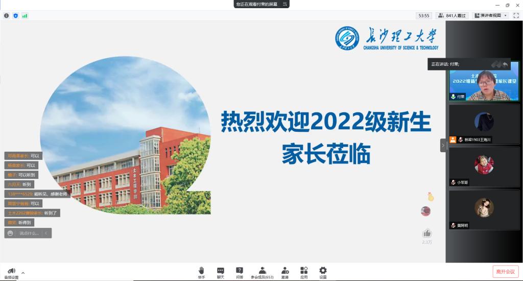 为深入贯彻全国教育大会精神,强化家校合作,8月26号,土木工程学院通过腾讯会议举办了主题为“家校联动育新人”2022级新生家长会暨家长课堂。学院党委副书记黄阿明老师、副院长付果老师,2022级新生辅导员林安妮老师及600多位新生家长参加会议。院学生工作办公室主任李小军老师主持会议。
