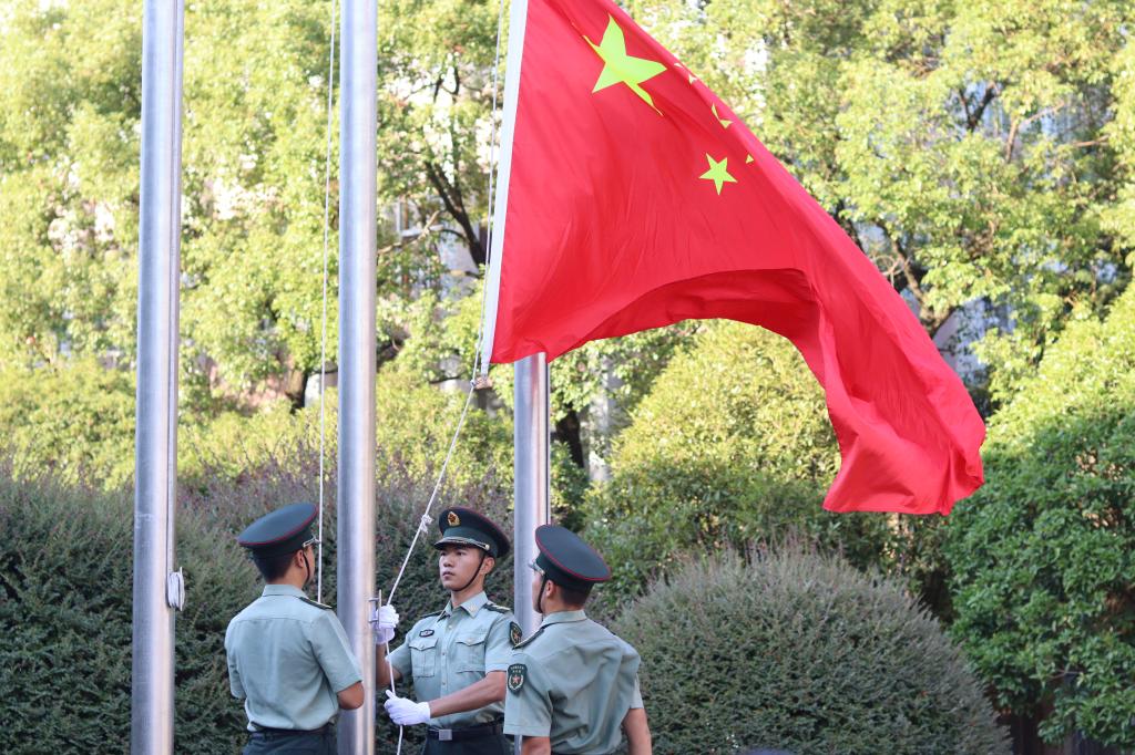 10月1日早,经济与管理学院师生在金盆岭校区办公大楼前举行升旗仪式。辅导员肖翠、杨舒文、吴畏,学院本科2021级、2022级学生代表迎着晨曦共同参与本次升旗。