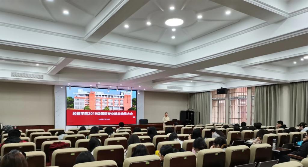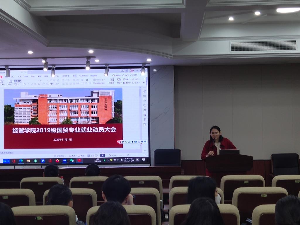 11月16日上午,经管学院在文科楼D207举行了2023届国贸专业毕业生就业再动员大会。会议由2019级辅导员何艳芝主持,学院党委副书记唐青、经贸系主任陈洁、副主任尹国君、学院就业辅导员段懿珊、2023届国贸专业毕业生参加。