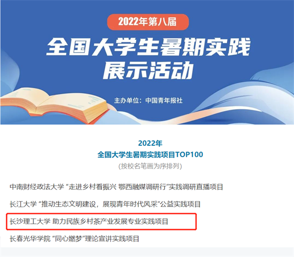 近日,2022年第八届全国大学生暑期实践展示活动名单公布,经济与管理学院“助力民族乡村茶产业发展专业实践项目”荣获2022年第八届全国大学生暑期实践TOP100。该项目是由经管学院敖洁教授指导,由2021级公共管理班王梦晗、张晗、刘雅杰、王秀梅、刘敏、2021级经济班石璐青等6名研究生组成的暑期社会实践团队完成。
