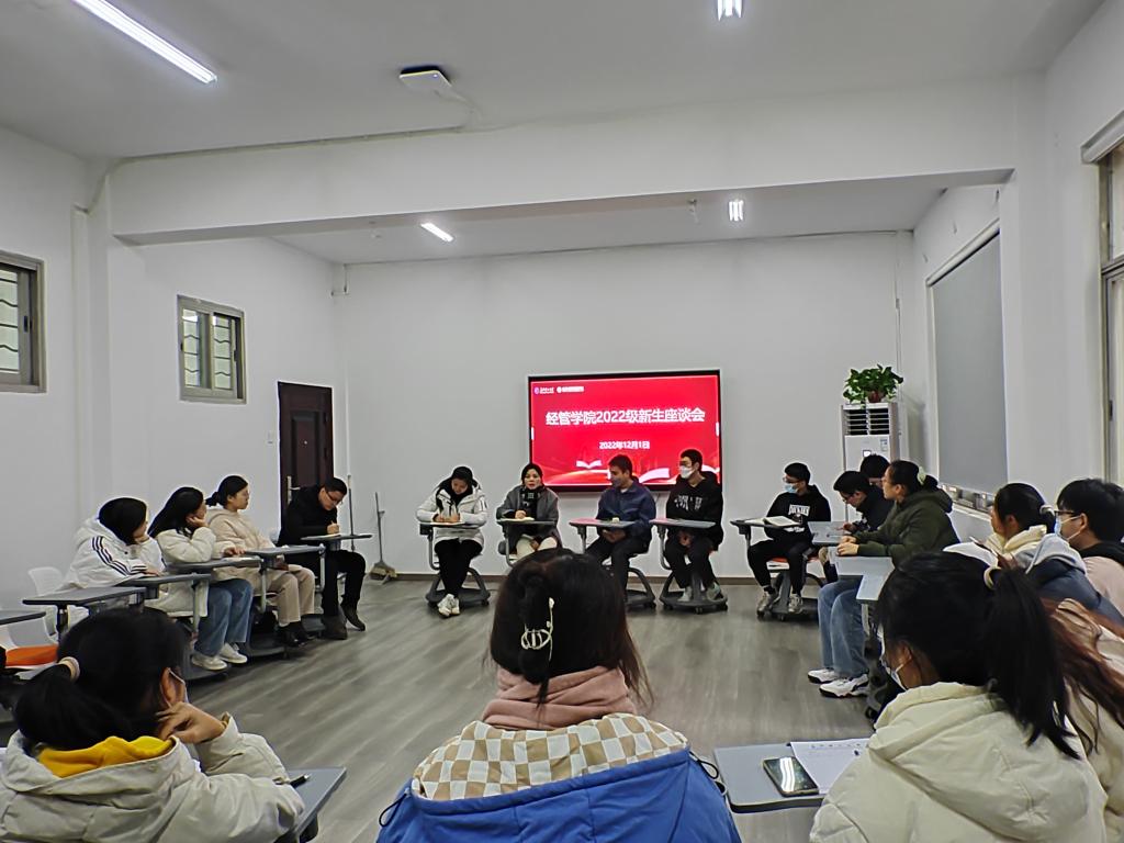 12月1日上午,经济与管理学院2022级新生座谈会在金盆岭校区办公大楼101召开。院党委书记丁丹、辅导员何涛以及24名学生代表参加了座谈会,会议由院党委副书记唐青主持。