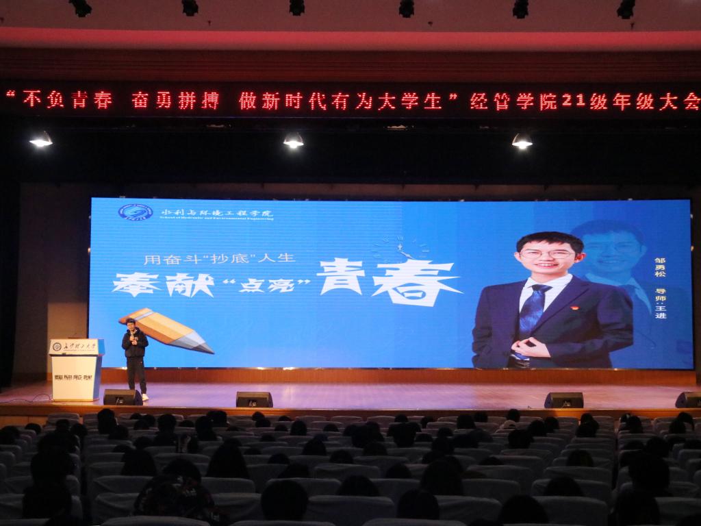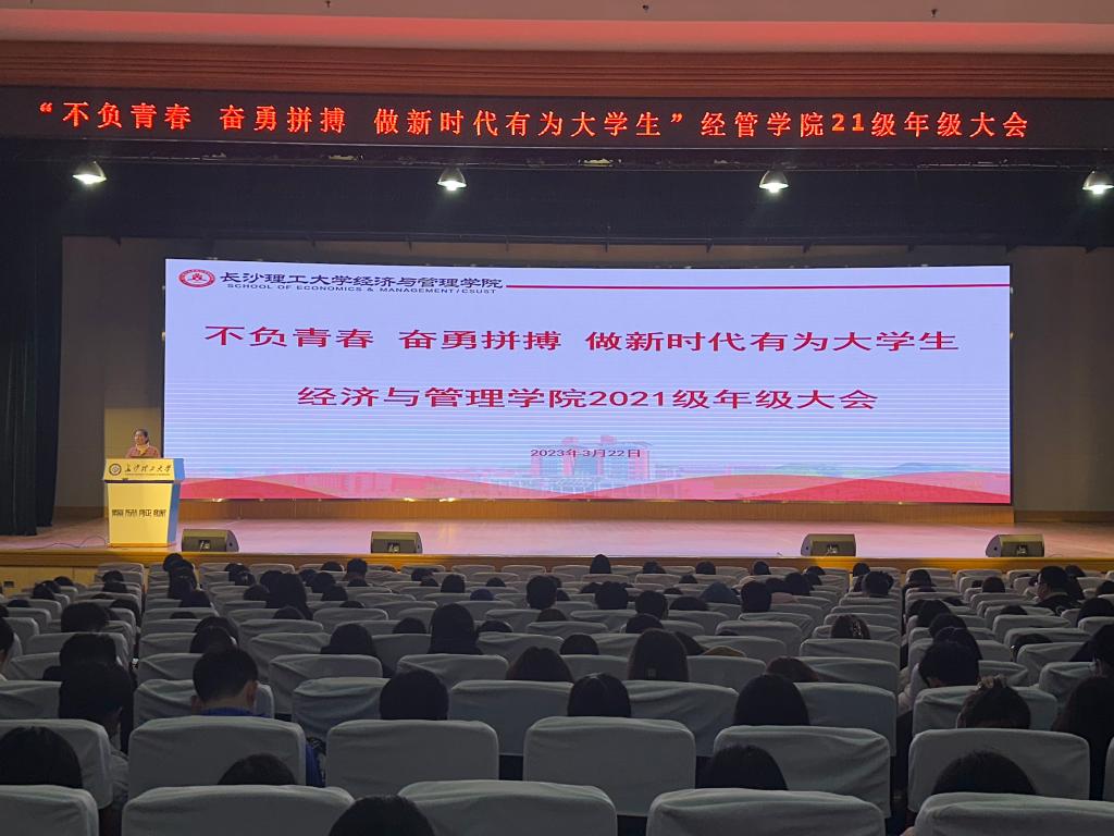 3月22日晚,经济与管理学院在金盆岭校区五教大礼堂召开2021级本科生年级大会,此次会议的主题是“不负青春 奋勇拼搏 做新时代有为青年”。院党委副书记唐青、年级辅导员王宝宝、杨舒文、2021级全体本科生参加了会议,会议由21级学生孟佳艺主持。