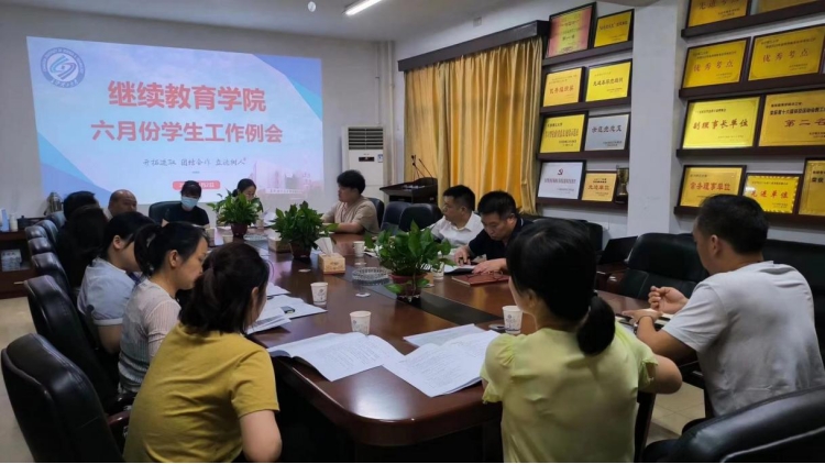 6月2日上午,在金盆岭校区15教三楼会议室,继续教育学院召开六月份学生工作例会。继续教育学院党总支副书记谢士成、学工部主任范石泉、学工部各位老师,以及各校企合作部负责人参加会议。