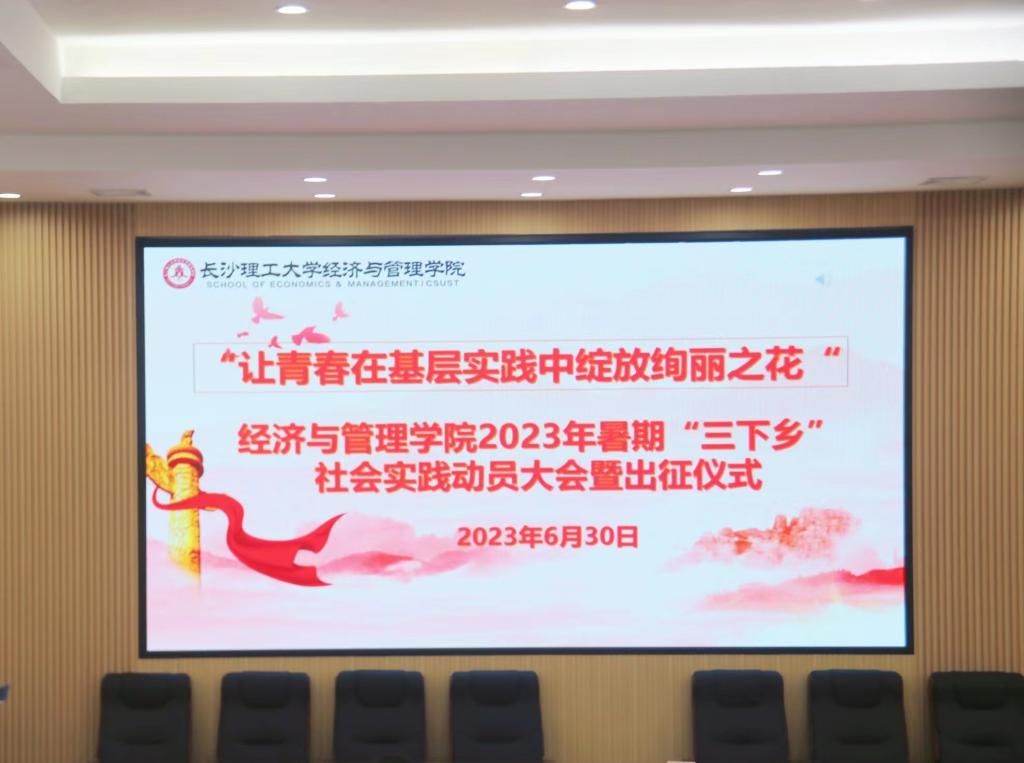 6月30日上午,经济与管理学院2023年暑期“三下乡”社会实践动员大会暨出征仪式在金盆岭校区办公大楼100举行。经管学院党委书记丁丹、副书记唐青,电气与信息工程学院周腊吾教授,经管学院团委书记何涛以及本次实践活动全体带队老师、190名实践队队员出席了会议。