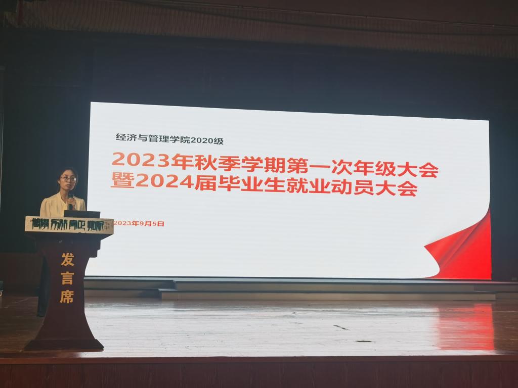为顺利开展2024届毕业生各项工作,让同学们积极面对就业,9月5日下午3:00,经济与管理学院在云塘校区大会堂召开了2020级学生年级大会暨2024届毕业生就业动员大会。学院党委副书记唐青、副院长王治,教务办贾郁、辅导员戴逢哲、优秀校友杨翔天及全体20级同学参加会议,会议由就业专干周路路老师主持。