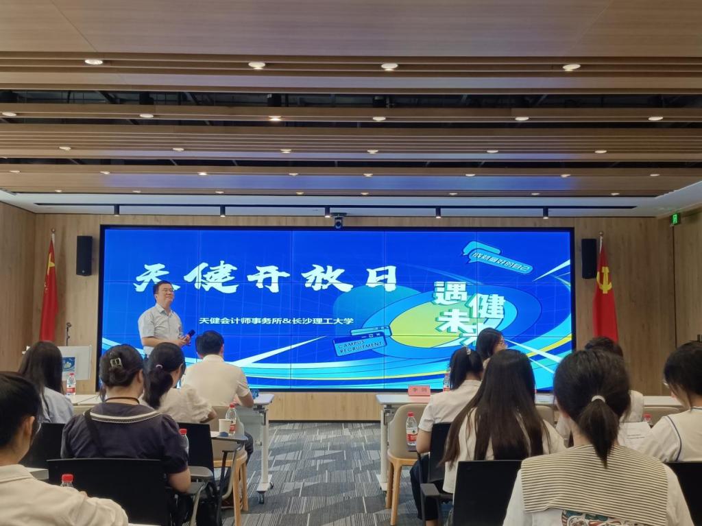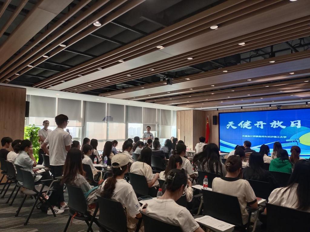 活动首先由伍超带领学生参观了位于市中心交银大厦的天健事务所工作区域,让同学们感受到公司拥有良好的工作环境与氛围。随后来到了多功能会议厅召开会议。首先师生们共同观看了天健宣传片《手可摘星辰》以及行业宣传片《湖湘注会行业青年说》,对天健会计师事务所和注册会计师有了初步的认识。接着,李剑向同学们介绍了天健会计师事务所基本情况、湖南分所基本情况以及天健文化与发展观。他表示,校企合作是学校和用人单位的互利互赢,能够培养出更多的社会栋梁之才。随后,长理优秀校友代表李旭东、樊梦萍回忆了自己的大学时光,感恩学校与学院对自己的培养,并讲述了自己毕业后的成长与经历,她们表示,在天健会计师事务所建立了自己的工作自信与工作体系,并祝福开云kaiyun体育与天健会计师事务所都能够更上一层楼。校友分享后,赵娇进行了“注册会计师审计——过去现在与未来”的主题分享,她从职业起源、行业现状、对未来的思考这三个方面为经管学子上了丰富且生动的一课。她表示,随着科技的发展,行业更加需要有大数据思维与数字化技能的人才,学生要注重提升自己的数字技能,迎合行业用人的需求。