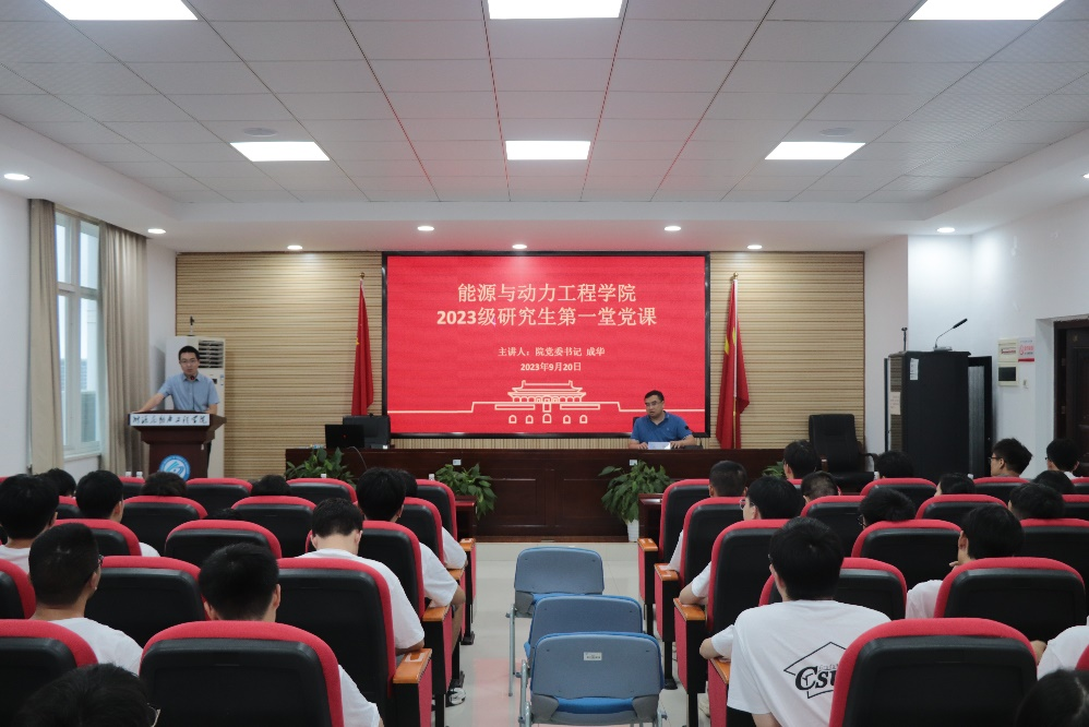 9月20日,能动学院2023级研究生第一堂党课于新能源大楼2栋502举行。本次党课由能动学院党委书记成华主讲,院党委副书记兼副院长张晓烽主持,研究生辅导员李觅及2023级全体研究生参加。