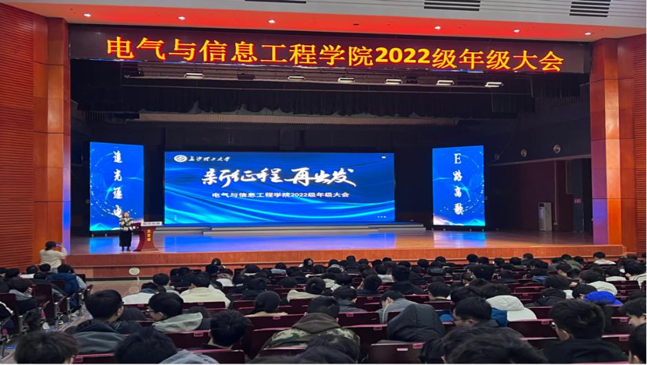 为深入落实“求真务实”的作风建设要求,营造良好学风氛围,巩固学风建设成果,引领广大青年大学生规划学业生活,3月7日晚,电气学院在云塘校区大会堂召开2022级年级大会,电气学院党委书记丁丹,电气学院党委副书记周巍,电气学院副院长王媛媛,学工办辅导员吴佳骐、2022级全体学生参加,大会由学工办主任楚艳鸽主持。