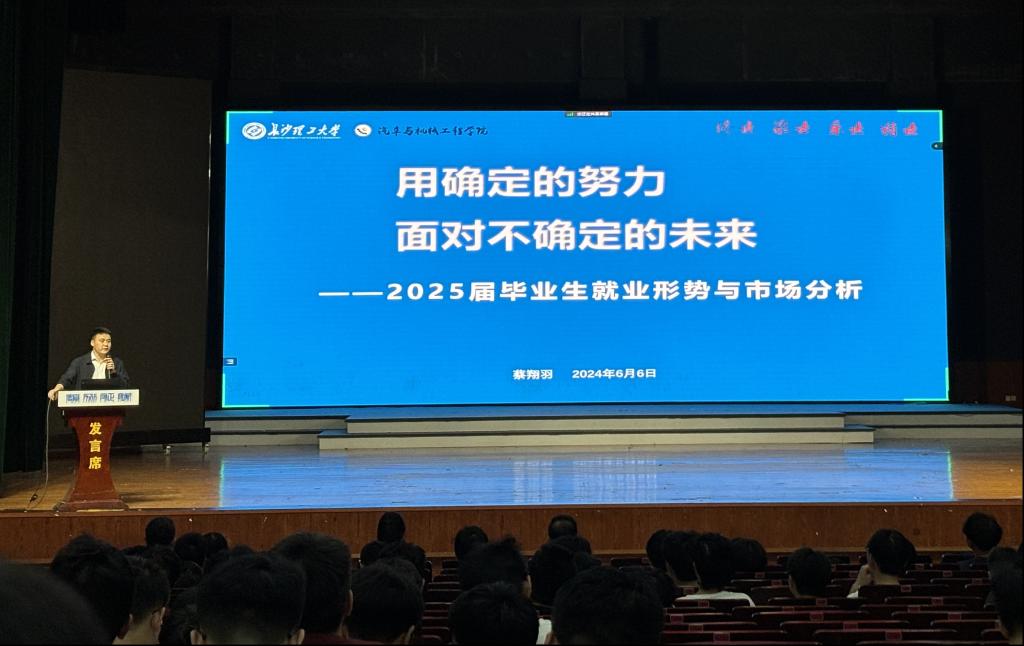 大会伊始,蔡翔羽以“用确定的努力,面对不确定的未来——2025届毕业生就业形势与市场分析”为主题,给21级本科生上就业指导课。蔡翔羽就全国、全校和本院三个层面的高校毕业生就业数据进行形势分析,从择业观念、就业途径、考研报考、就业准备等方面与同学们展开交流,旨在引导21级的同学们树立正确就业观并进行科学合理的大四学年决策和生涯规划。