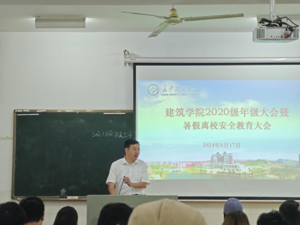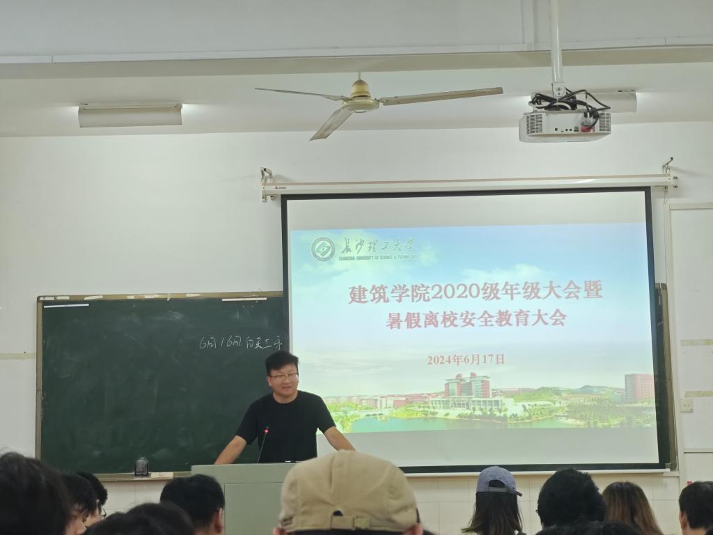 暑假将至,为做好期末总结,帮助学生熟悉即将进入毕业年级后的相关安排,切实增强学生的风险防范意识和避险能力,提升同学们在暑假期间的安全意识,保障学生人身和财产安全,6月17日上午,建筑学院在金盆岭校区16教313召开了2020级期末总结暨寒假暑假安全教育大会,学院党委副书记李家春、年级辅导员郭恒、就业专干王宇霖、各系系主任及2020级全体学生参会。