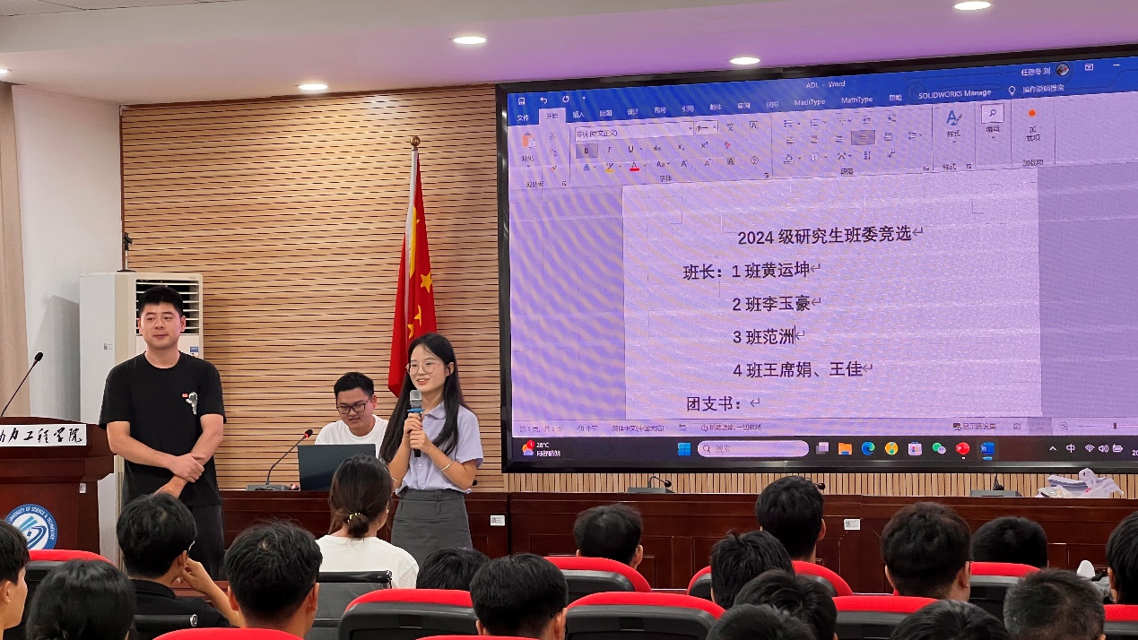 会议上还进行了2024级研究生班委竞选,研究生新生积极上台发表演讲,踊跃竞选班委,展现出能动学院新一代学子勇于争先的精神面貌,最后在大家的投票下,2024级研究生班委选举产生,本次班会圆满结束。