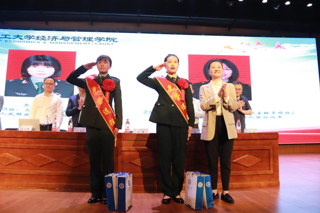 典礼上,院长彭新宇为过去一年中分别荣获学校卓越研究生奖学金以及校十佳大学生的熊智桥、程杰和姚雁琼颁奖。马丽为2024级研究生郑欣姣和2022级本科生文思汝送上退役复学礼物。