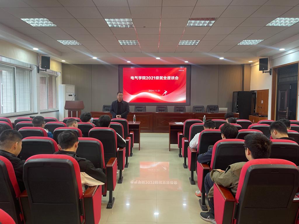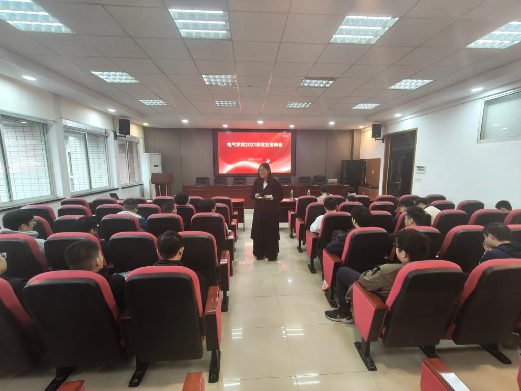 11月21日,电气学院在工一B503召开毕业生就业座谈会,电气学院党委副书记周巍,就业中心主任欧彩玲,毕业生辅导员田孟萍、张一鸣,学院待就业毕业生参会。
