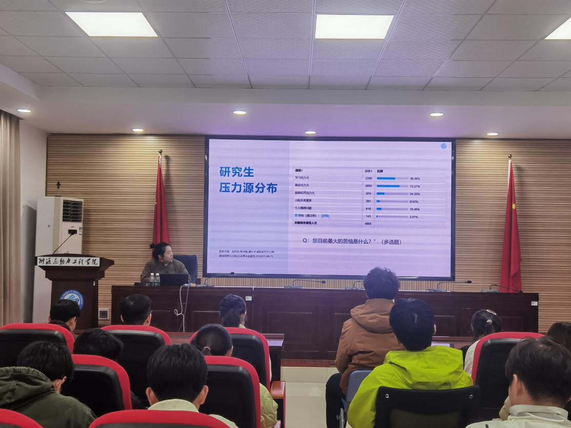 罗亦欧以“压力、情绪与自我”为主题,分别从研究生心理健康状况、压力与心理健康、情绪管理三个方面进行详细讲解。通过学校2024年秋季研究生思想状况调研报告与研究生心理健康的相关论文中的数据,分析了当前社会研究生的心理健康状况;通过引入案例,解读了压力是什么及苦难教育给我们带来的压力,分析了长期压力的影响及应对压力的步骤;讲述了如何认识、觉察情绪,通过引入一些情景模拟,穿插讲述了研究生如何缓解自己的情绪、自查心理状态。最后,罗亦欧为研究生提供了心理咨询的渠道,推荐了经典书籍和电影供同学们课后阅读和观影。