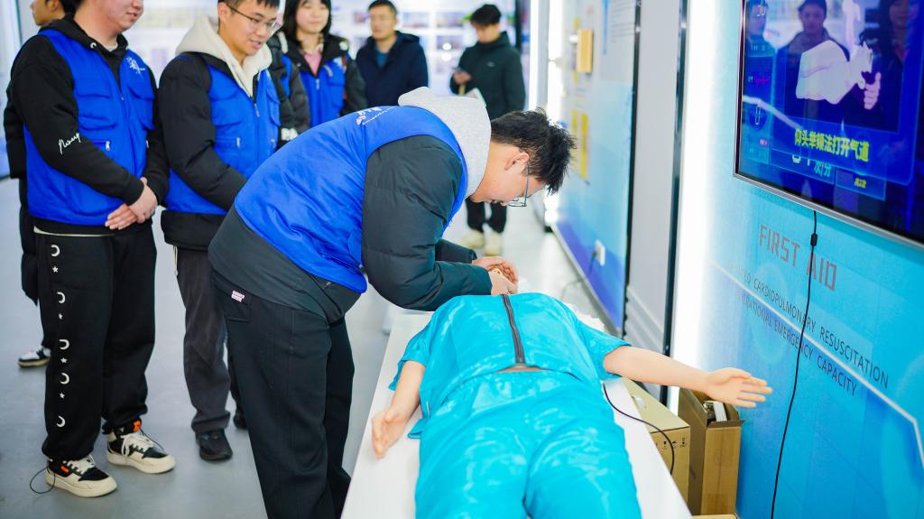 在安全教育中心,开启了互动实训。在安全帽体验区,同学们通过佩戴专业设备,亲身体验了重物坠落的模拟冲击,深刻理解了安全帽的重要性;而在触电体验区,同学们更是亲自上阵,通过模拟触电感受电流的危害,进一步增强了安全意识。此外,急救区大屏幕展示的实时操作指南详细演示了正确的急救技能,使安全教育深入人心。