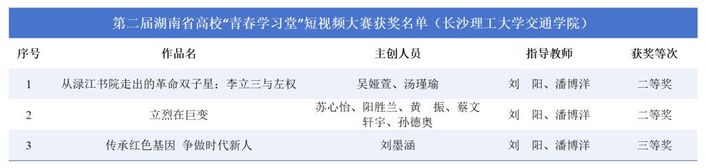 近日,第二届湖南省高校“青春学习堂”短视频大赛评选结果揭晓。开云官网交通学院师生凭借出色的创意与扎实的思政素养,共荣获学生组二等奖2项、三等奖1项,展现了学院在思政教育与新媒体融合实践中的实践成果。