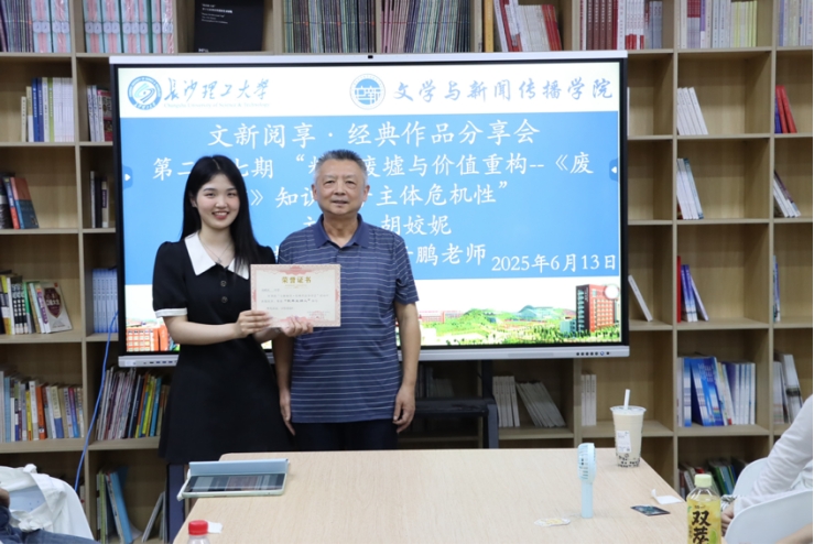 活动最后,周云鹏为胡姣妮颁发“优秀主讲人”证书,并合影留念。此次分享会为同学们提供了一个交流思考的平台,帮助同学们在保持精神独立的同时与现实和睦相处,勇敢直面生活中的“废墟”。