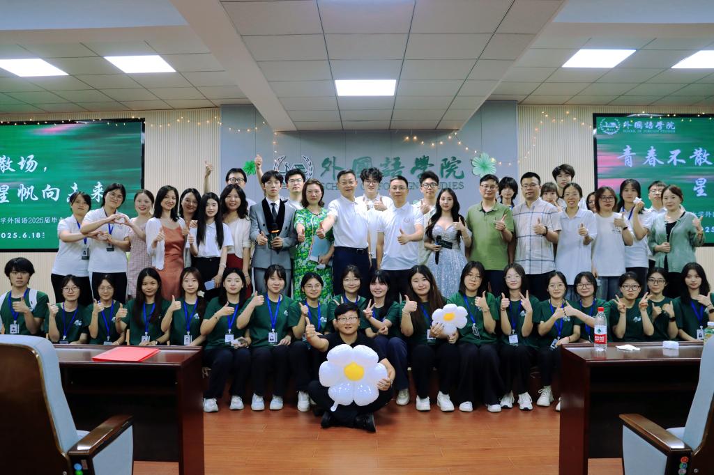 6月18日晚,外国语学院“青春不散场,星帆向未来”2025届毕业晚会在金盆岭校区三教321报告厅举行。学院党委书记陈仁凯、院长段胜峰、党委副书记周芳、副院长姚尧,党委委员陈菁、冯春、张志武,学院教师、全体辅导员,特邀嘉宾郑延国教授、陈建生教授以及全体毕业生出席。