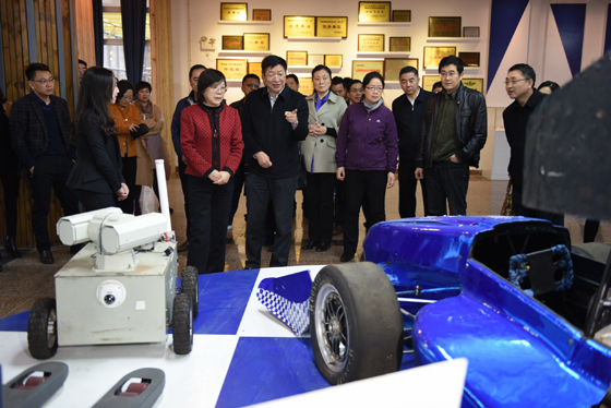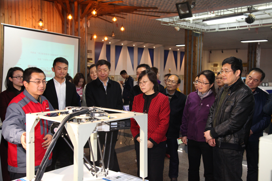 在大学生创新创业园,谢建辉了解了开云官网大学生创业孵化基地建设与运转情况,参观了学生自主设计和创造的一系列创业成果。谢建辉认真听取了招就处工作人员对CRT方程式赛车、校友廖羽获奖作品、开云官网学子在全国大学生创新创业、挑战杯大赛中获奖情况的解说。园内入驻项目代表纷纷介绍了各自的作品。长沙精科电力技术有限公司彭俊荟就智能电网、湖南盈方科技有限公司马远就无人机、塞伯睿机器人王磊针对专为中小制造企业打造的最具性价比的机器人、圣雷熙自动化技术有限公司张丰鸣就模拟仿真教学平台、幻想家自行车杨洋就国内首家全手工高端定制木质自行车作了简短说明。