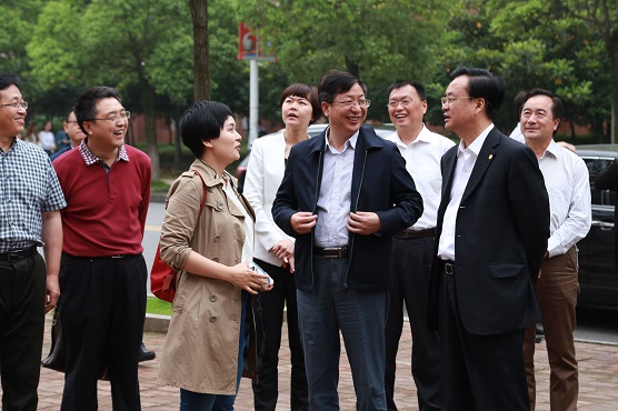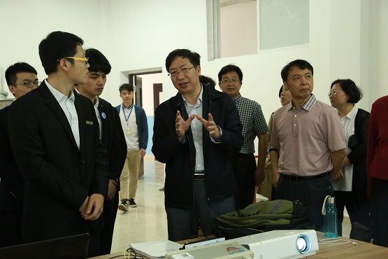 付宏渊与曹敏一道参观了大学生创新创业园展厅,仔细观看了机器人、方程式赛车、无人飞机以及全国大学生结构设计大赛、全国电子设计竞赛获奖作品等大学生科技创新实物。随后,领导们深入项目团队工作室,与工作室的指导老师和学生亲切交流,对他们创新务实的精神给予高度评价,对进一步加强产学研结合,进一步深化创新创业教育教学改革提出了积极建议。付宏渊表示,创新创业教育要落实好“四个融入”,要发挥好大学生在创新创业教育中的主体作用,积极塑造大学生的创新精神,积极调动蕴藏在青年大学生群体中的创新潜力。他对大学生创新创业园的建设表示肯定,并指出大学校园应该多一些类似于“创客空间”这样的大学生交流、休闲的开放平台和场所,同时鼓励创新创业园项目多与社会企业合作,争取更多的社会资源。