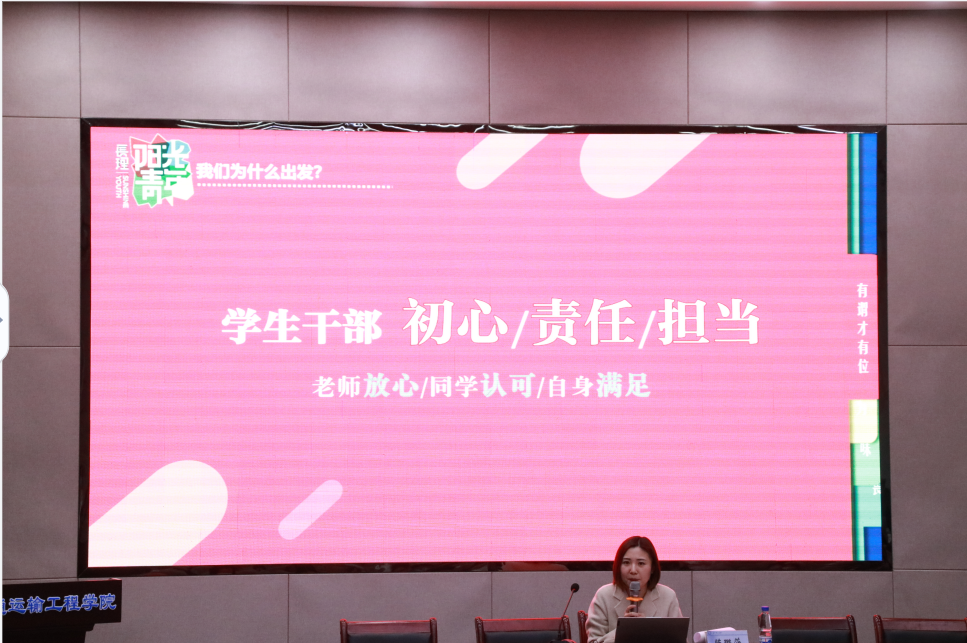 陈璐莎从学生干部的初心、责任、担当展开本次课程,她认为学生干部应当确定自身定位,不忘为同学服务的初心,对学生工作保持热情,牢记自身责任与担当,严以律己。陈璐莎从外在和内在两个方面详细讲解了学生干部工作的方式及方法:在外在方面,陈璐莎表示学生干部应做好待人接物、礼貌礼仪等细节,在实践中寻找和把握工作规律;在内在方面,陈璐莎对校园追星现象、电动车使用情况、国家方针、重要会议精神的学习情况等发表意见,并希望学生干部提高判断力、执行力、领悟力三方面能力。随后,陈璐莎从学生干部自我认同及获得感方面进行讲解,她认为,只有牢固树立大局观意识,做好表率作用,切实为同学们服务,才能提高自我认同感及获得感。