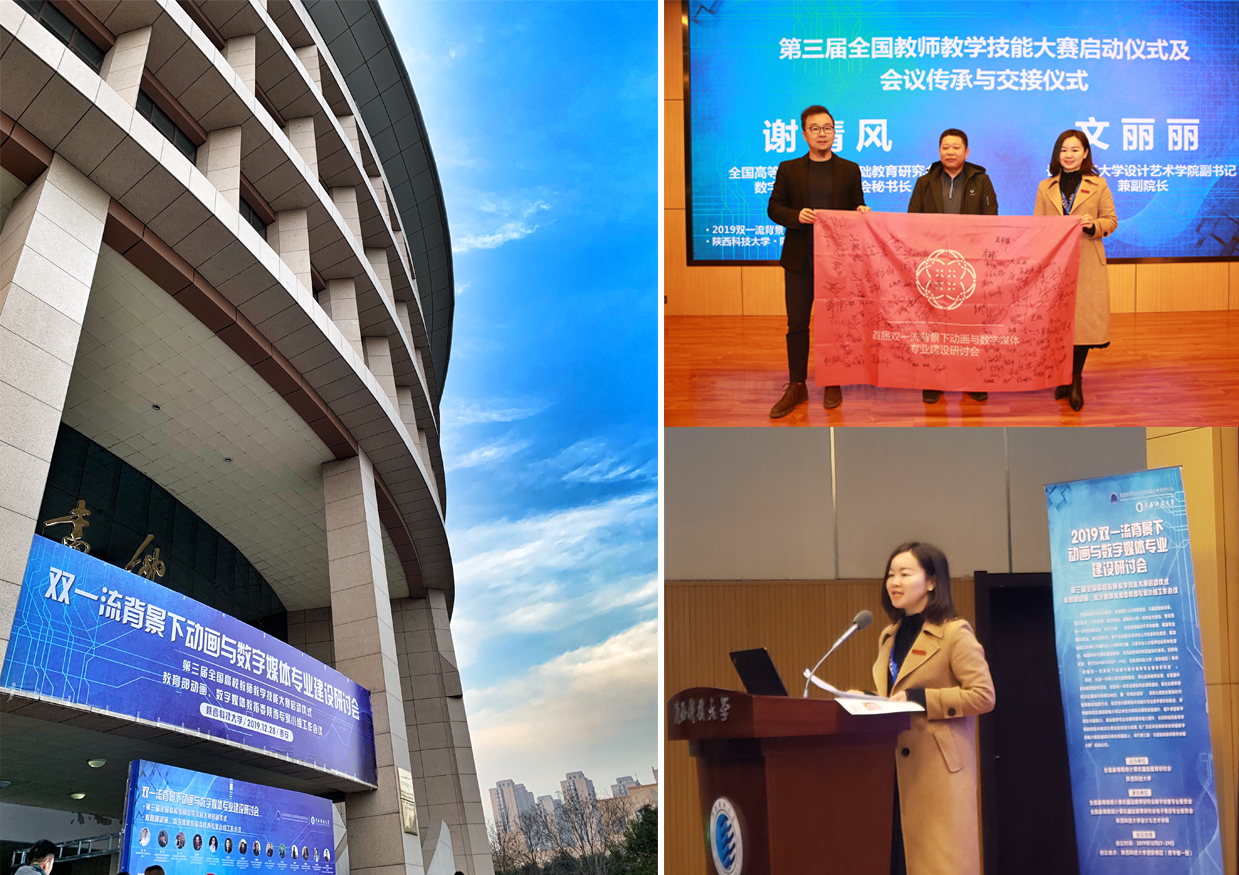 12月28日,首届双一流背景下动画与数字媒体专业建设研讨会在陕西科技大学举办,艺术学院党委副书记文丽丽和数字媒体艺术专业系主任朱诗源、专业老师吴昕昕参加了会议,文丽丽代表学校参与了承办研讨会的交接仪式。