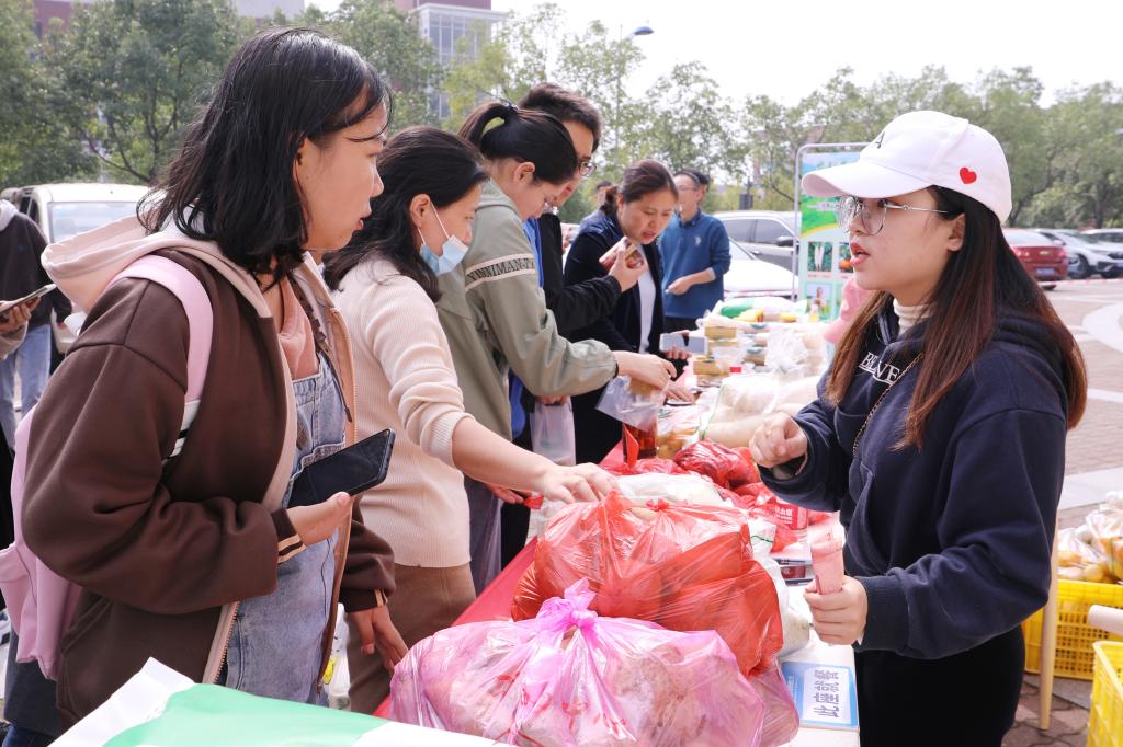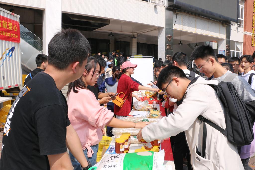 清香的柑橘、水灵灵的萝卜、绿色生态的竹泉米以及红薯、土豆、土蜂蜜……10月27日上午,来自开云官网扶贫点枧杆山村的货车开进了云塘校区,车上载满了萝卜等十余种农副产品,这些农副产品被整整齐齐地摆放在食堂甘饴园门口,形成了一个移动超市,吸引了师生驻足围观抢购。