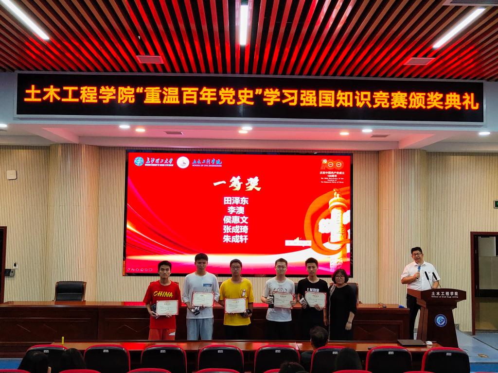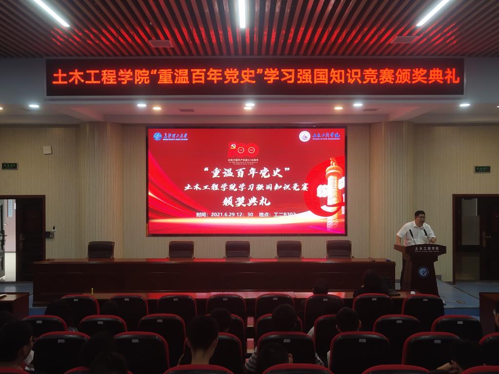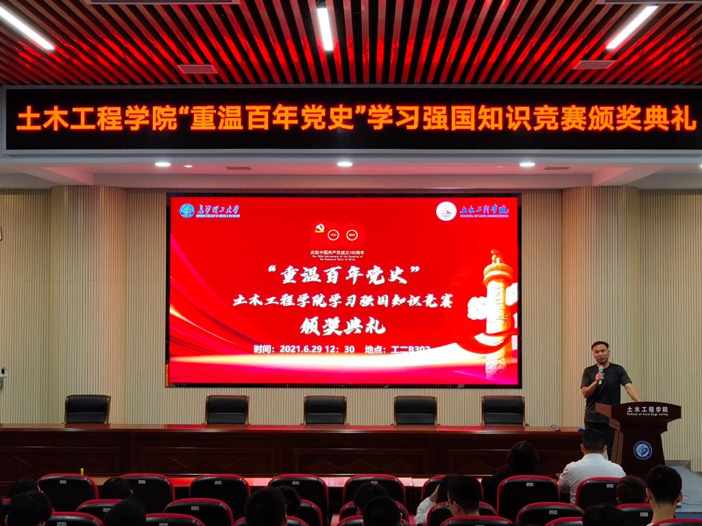 李小军首先宣读《土木工程学院“重温百年党史”学习强国知识竞赛获奖人员名单》,胡小杰等20名同学获得优胜奖,黎布凡等15名同学获得三等奖,谢薇等10名同学获得二等奖,田泽东等5名同学获得一等奖。土木1910班和2020级学术硕士班分获优秀组织奖。