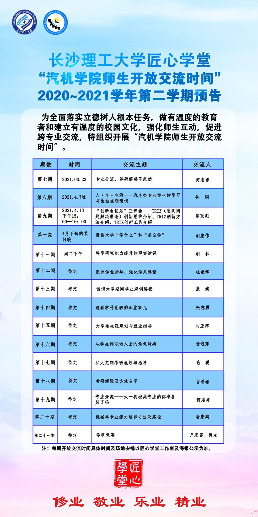 聚焦学生关注热点,推行“开放交流时间”,是汽机学院学党史、办实事的有力举措。同学们通过“匠心学堂”小程序自主预约参与“开放交流时间”的主题。目前已预定21期,主题涵盖专业分流、生涯规划、学业指导、学科竞赛等学生关注的学习生活热点,已参与学生400余人次。