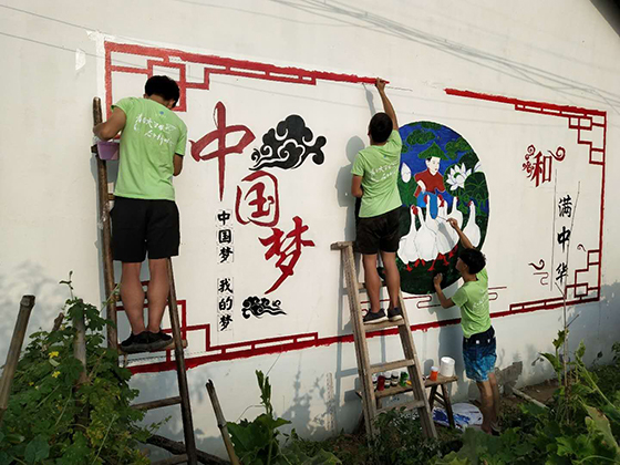 昨天的一场大雨洗净尘埃,天气却也是愈发的好了,早晨七点钟的太阳便已让大家大汗淋漓,照在白墙上晃得大家睁不开眼,但这一切并不是问题,大家克服一切困难,于7月24日圆满完成两面墙的墙绘。