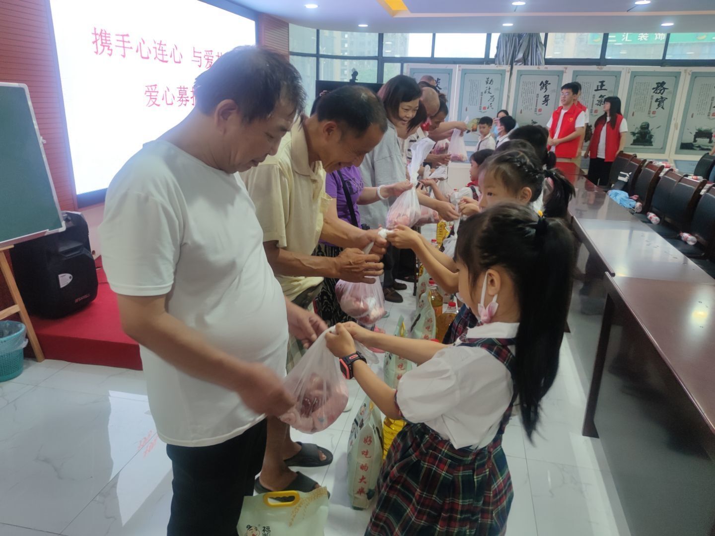 活动伊始,黄土岭小学学生进行才艺表演,孩子们通过歌唱、武术表演、朗诵等节目,为社区困难群众带来欢声笑语。紧接着是爱心募捐仪式,由家长引导孩子们捐出零花钱,并为困难群众献上米、油、肉等慰问品,与此同时也将甘于奉献的精神与乐于助人的正能量传递到社区群众中。最后由龙之彤带来主题宣讲——“国旗的故事”,他从国旗的设计和形成过程开始讲起,讲述了在国旗定稿过程中发生的故事,深入剖析了国旗的寓意和内涵,通过国旗故事引导孩子们热爱国旗、尊敬国旗,培养孩子们的爱国情怀。