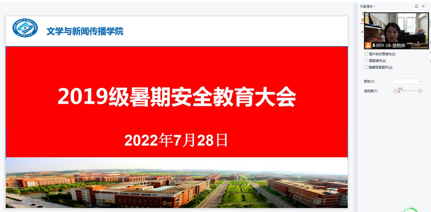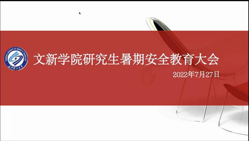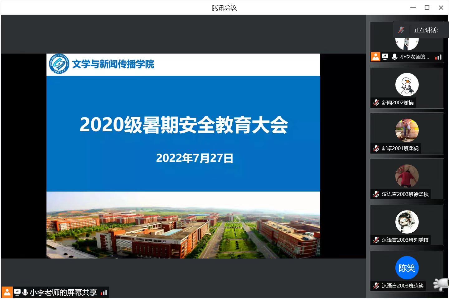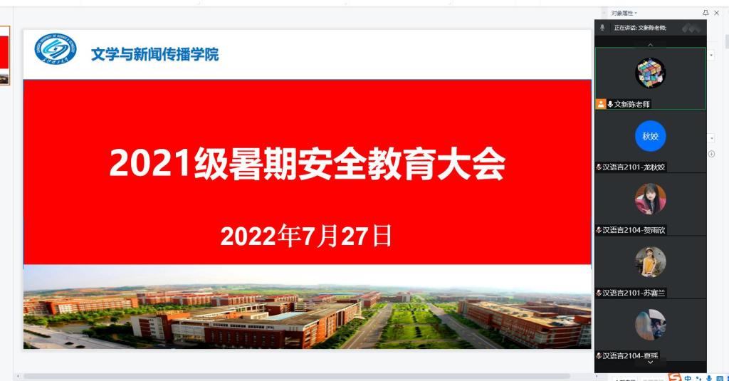 快乐一“夏”,安全第一。为进一步筑牢安全防线,近期,文新学院通过开展“云课堂”的方式对全体在籍本科生、研究生开展暑假安全教育大会。
