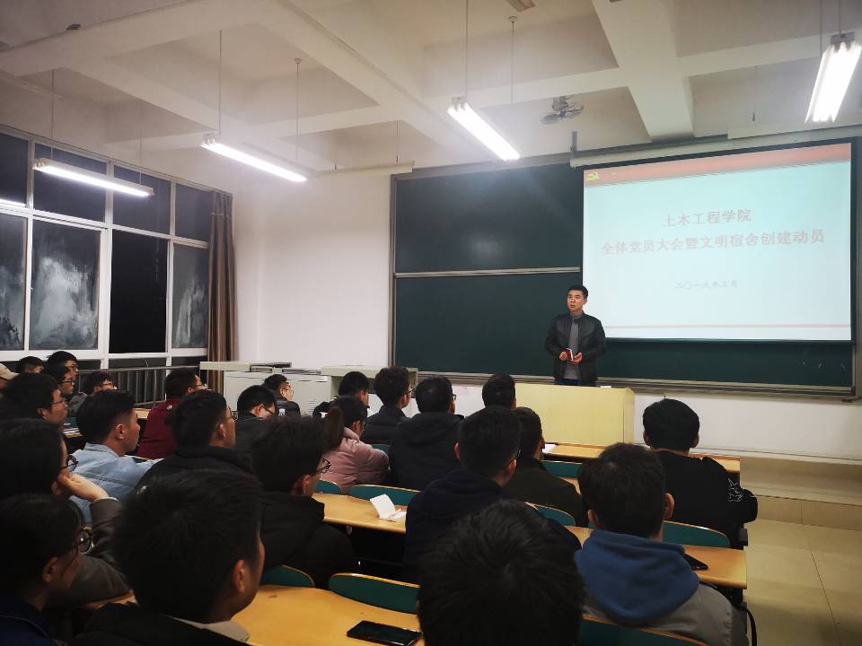 根据开云官网2019年工作要点,积极开展学生劳动教育,提高学生文明素养,强化学生劳动观念,将学生宿舍打造养成教育的坚实基地。3月11日晚,土木学院在工三A208召开新学期全体学生党员大会暨文明寝室创建动员,学院党委副书记王煜坤、学工办全体辅导员参加。