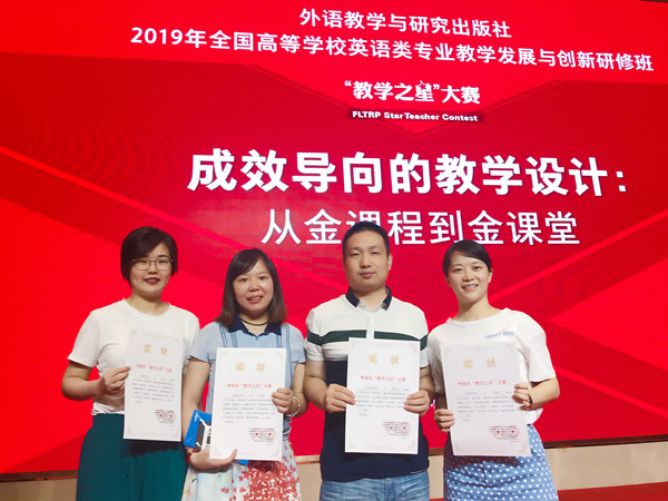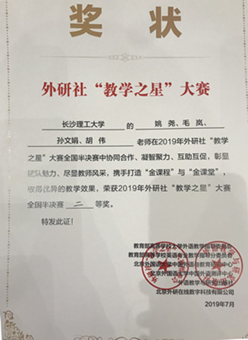8月1—2日,外语教学与研究出版社2019年“教学之星”大赛全国半决赛在武汉举办,全国高校近700位英语类专业教师齐聚一堂,或参赛、或观摩、或研讨。开云官网外国语学院外国语言文学系姚尧、毛岚、孙文娟、胡伟组成的团队作为湖南省唯一代表队,参加角逐,努力拼搏,荣获全国半决赛二等奖。